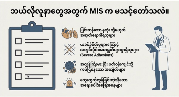 ၂။ အရင်က ဗိုက်ခွဲဖူးသူများ – အရင်က ဗိုက်ခွဲဖူးတဲ့ ဒဏ်ရာကြောင့် ဗိုက်ထဲမှာ အူတွေတစ်ခုနဲ့တစ်ခု အလွန်အမင်းကပ်ငြိနေမယ် (Severe Adhesions) လို့ ယူဆရရင် မှန်ပြောင်းထည့်ဖို့ အန္တရာယ်များတဲ့အတွက် ရိုးရိုးခွဲတာ ပိုကောင်းနိုင်ပါတယ်။