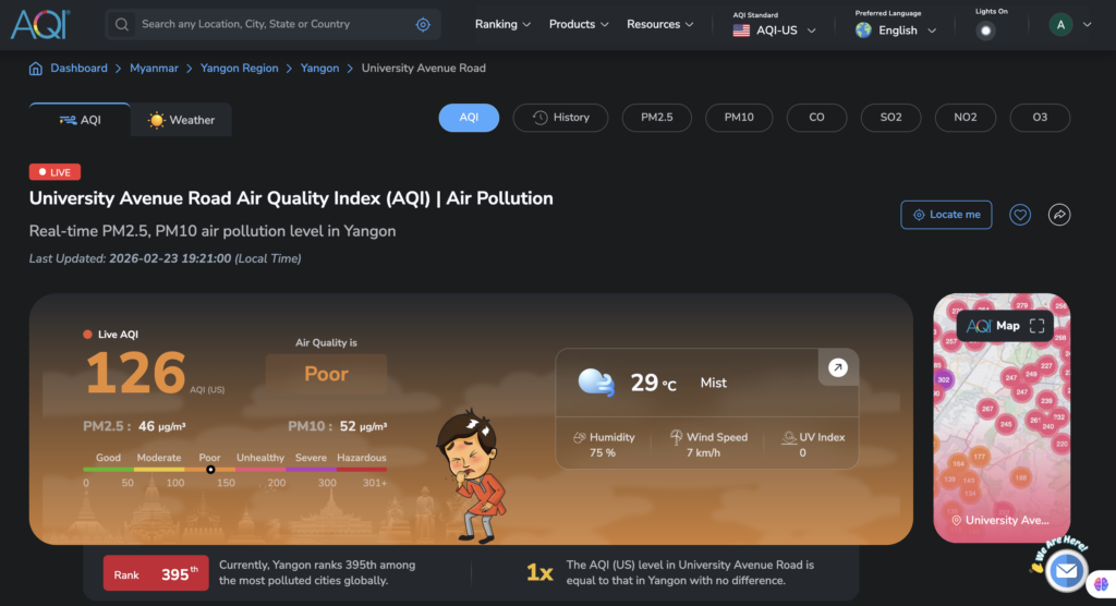 မြန်မာနိုင်ငံရဲ့ စီးပွားရေးမြို့တော်ဖြစ်တဲ့ ရန်ကုန်မြို့ရဲ့ လေထုညစ်ညမ်းမှုအခြေအနေက အနီရောင် အဆင့်ရှိနေပြီလို့ ကမ္ဘာ့လေထုအရည်အသွေးတိုင်းတာမှုတွေကို စဉ်ဆက်မပြတ် ဖော်ပြနေတဲ့ IQAir က ထုတ်ပြန်လိုက်ပါတယ်။​ ရန်ကုန်မြို့လယ်ခေါင်ဖြစ်တဲ့ ဒဂုံမြို့န​ယ်မှာဆိုရင် လေထုညစ်ညမ်းမှုဟာ ၁၉၂ အထိ ရှိနေပြီး ညစ်ညမ်းမှုအဆင့်ဟာ ကမ္ဘာ့အဆင့် ၄ အထိ ရှိနေပြီလို့ IQAir က သတိပေးထားပါတယ်။​